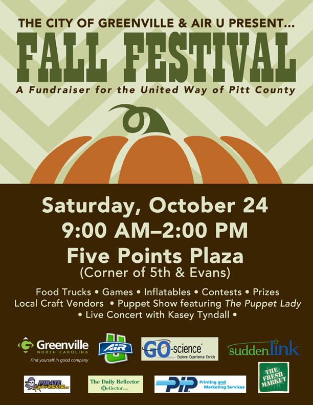 Get in on the fun at the Fall Festival, co-sponsored by the City of Greenville and Air U. The event will be held October 24th at 5 Points Plaza in Uptown Greenville. All proceeds go to benefit United Way of Pitt County.