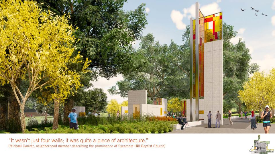 Historically, the Greene Street Bridge, which bordered the western façade of the Sycamore Hill Baptist Church, was once the primary entrance into the central business district of Greenville. In fact, the beautiful features of the church were the first of architectural significance experienced by visitors upon entering the central business district of the city. The Sycamore Hill Gateway Plaza transforms the western edge of Town Common into the prominent entrance that it once was while commemorating the history and memory of the Shore Drive neighborhood.